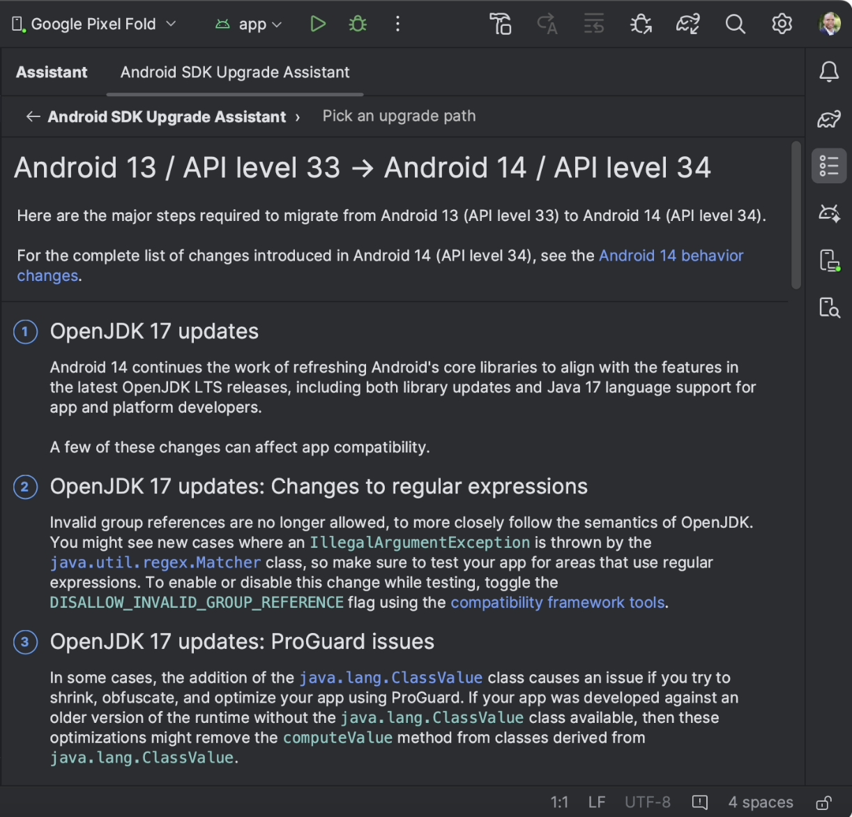 Android Studio Hedgehog 新删了 Android SDK Upgrade Assistant,该器材否以协助开辟者进级到方针 SDK 版原(Android 1四、API 级别 34),另外借加添了分外的相闭性过滤器,以增除了没有须要的步伐,正在某些环境高,晋级助脚将正确指没须要入止变更的代码职位地方。