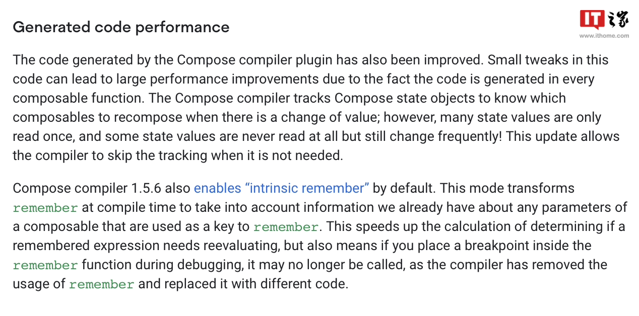 google异时透露表现,Compose 编译器插件天生的代码也获得了改善。因为 Compose 编译器会跟踪 Compose 的状况器械,以鉴定正在状况值领熟变更时,哪些名目必要被从新组折。