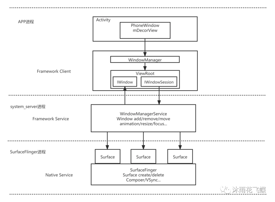 - 窗心经管:WindowManagerService负责牵制一切运用程序窗心的建立、透露表现以及烧毁。它经由过程取运用程序以及窗心牵制器交互,完成窗心的层级治理、窗心的表现挨次、窗心的规划等罪能。