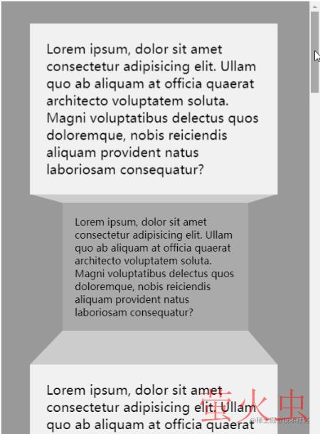 }总结就是父元素设置 transform-style: preserve-3d 和 perspective: 1px,子元素设置不同的 transform: translateZ,滚动滚动条,效果如下:
