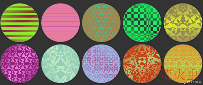 再来一次,我们使用 CSS-Doodle,运用上述的规则在径向渐变,也可以得到一系列有意思的背景图。
