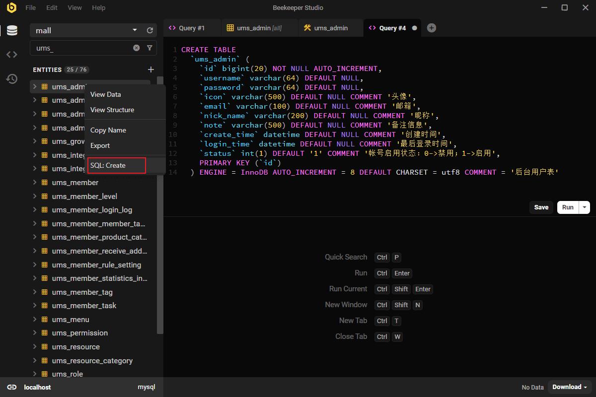 右键菜单还可以查看表的创建语句,这SQL主题样式,确实挺漂亮的;