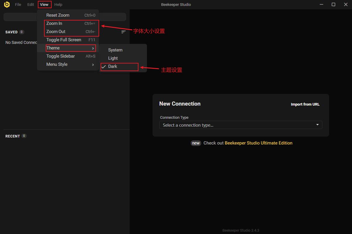我们可以通过顶部的View菜单按钮进行字体大小和主题设置,我们把它切换到更炫酷的深色主题。