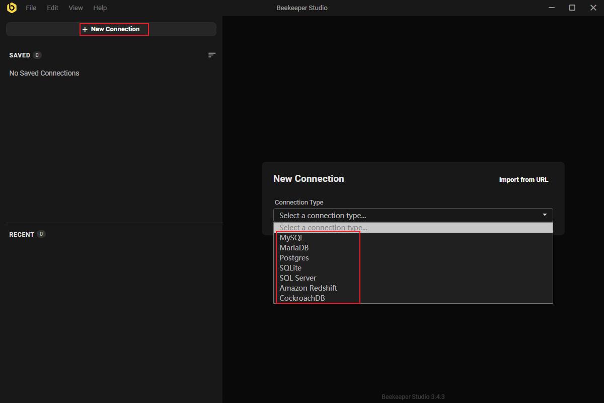 我们可以通过顶部的New Connection按钮来创建数据源,这里我们可以发现Beekeeper Studio仅支持常用的几种关系型数据库;
