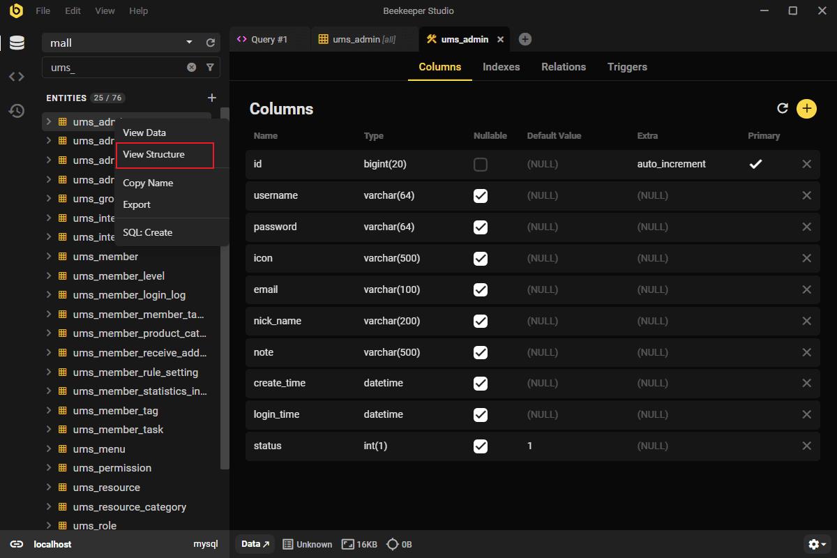 右键菜单还可以查看表结构,管理字段还是挺方便的;