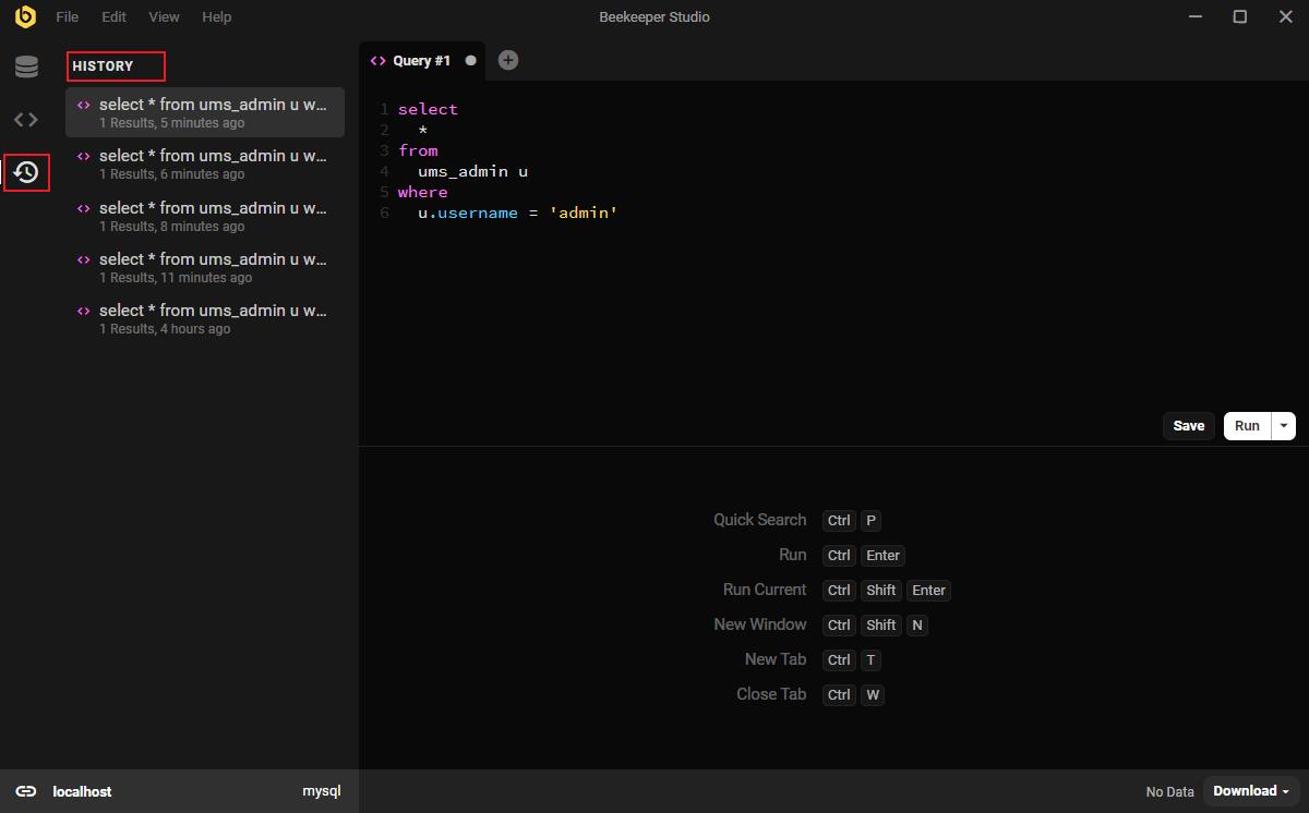 通过左侧按钮我们还可以查看执行SQL的历史记录。