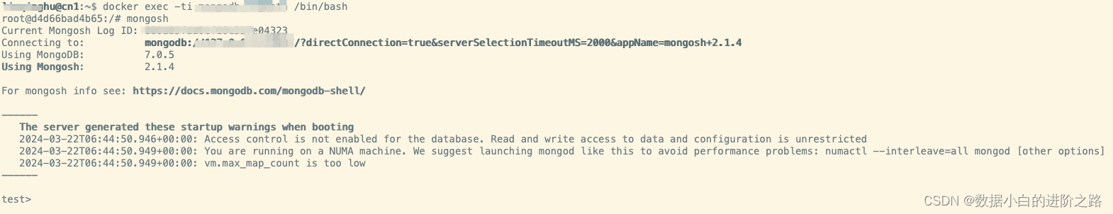 入进到容器外部后,运用呼吁mongosh入进到号令止执止页里: