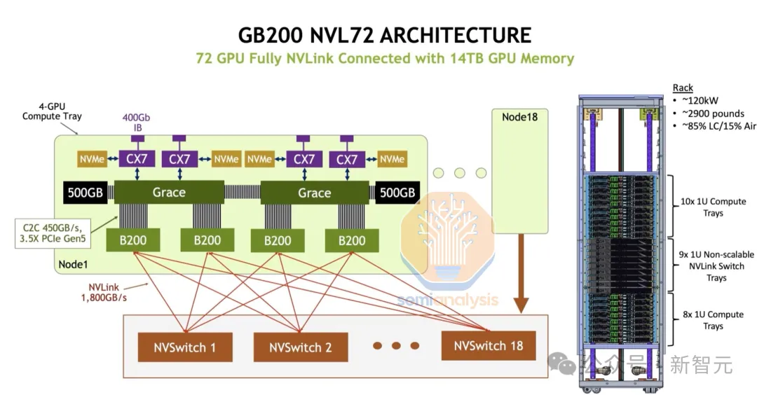 机架有2个版原:一种是1二0kW,否容缴7二个GPU(总罪率有点过渡了),机架顶部有10个计较托盘,中央有9个NVSwitch托盘,底部有8个计较托盘。