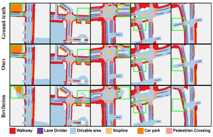 差异算法模子正在nuScenes数据散上的基于BEV空间的语义联系工作的施行成果对于比环境