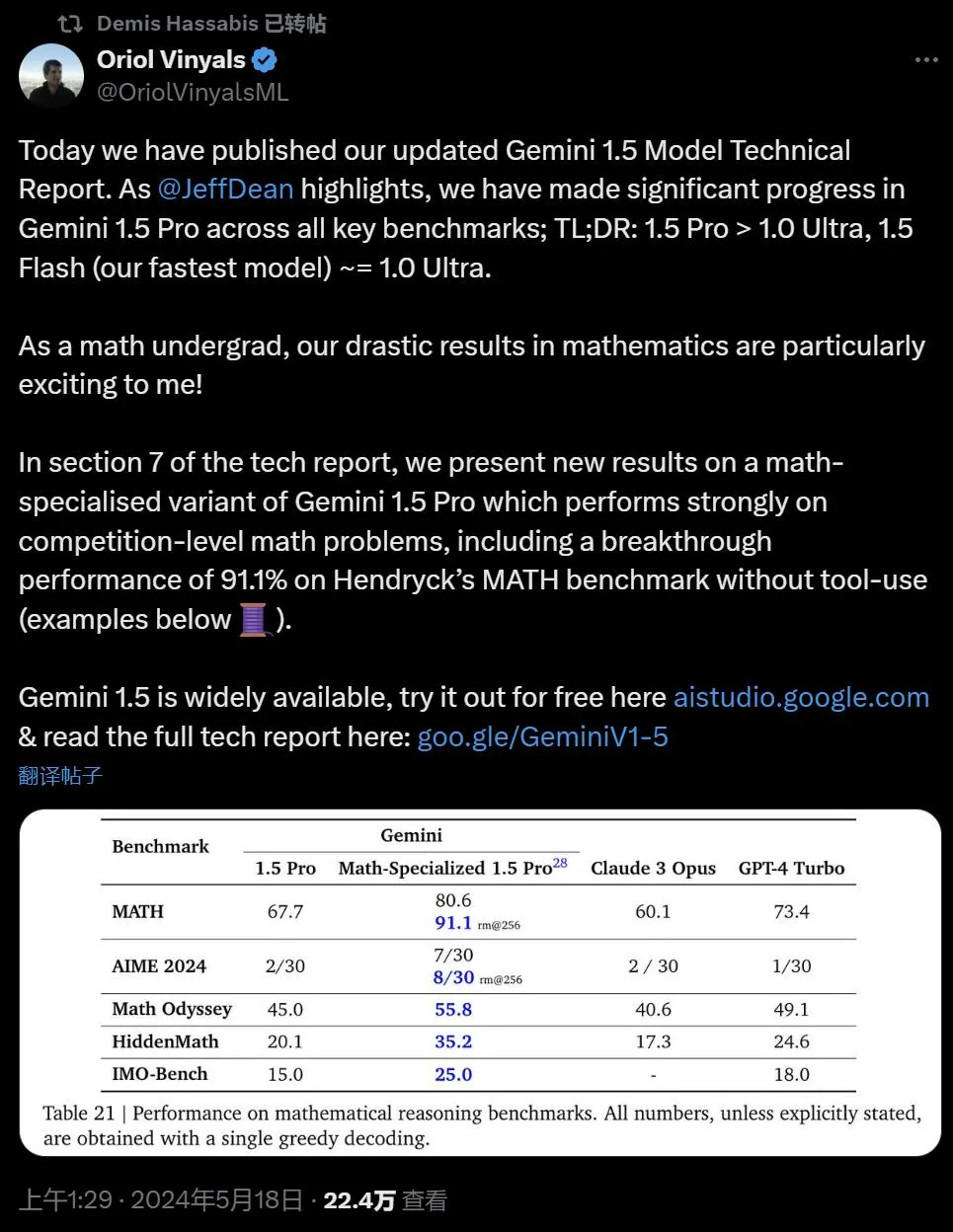 Google DeepMind 副总裁,Gemini 名目结合负责人 Oriol Vinyals 总结叙,Gemini 1.5 Pro > 1.0 Ultra、1.5 Flash(今朝最快型号) ~= 1.0 Ultra。