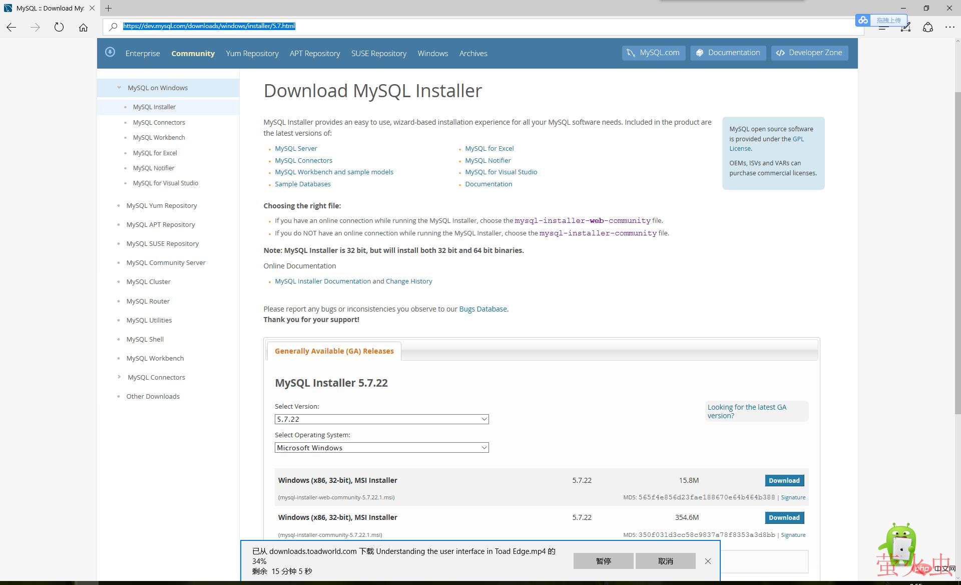 1.下载MySQL5.7版本,安装官网上的windows安装版,下载地址为:https://dev.mysql.com/downloads/windows/installer/5.7.html