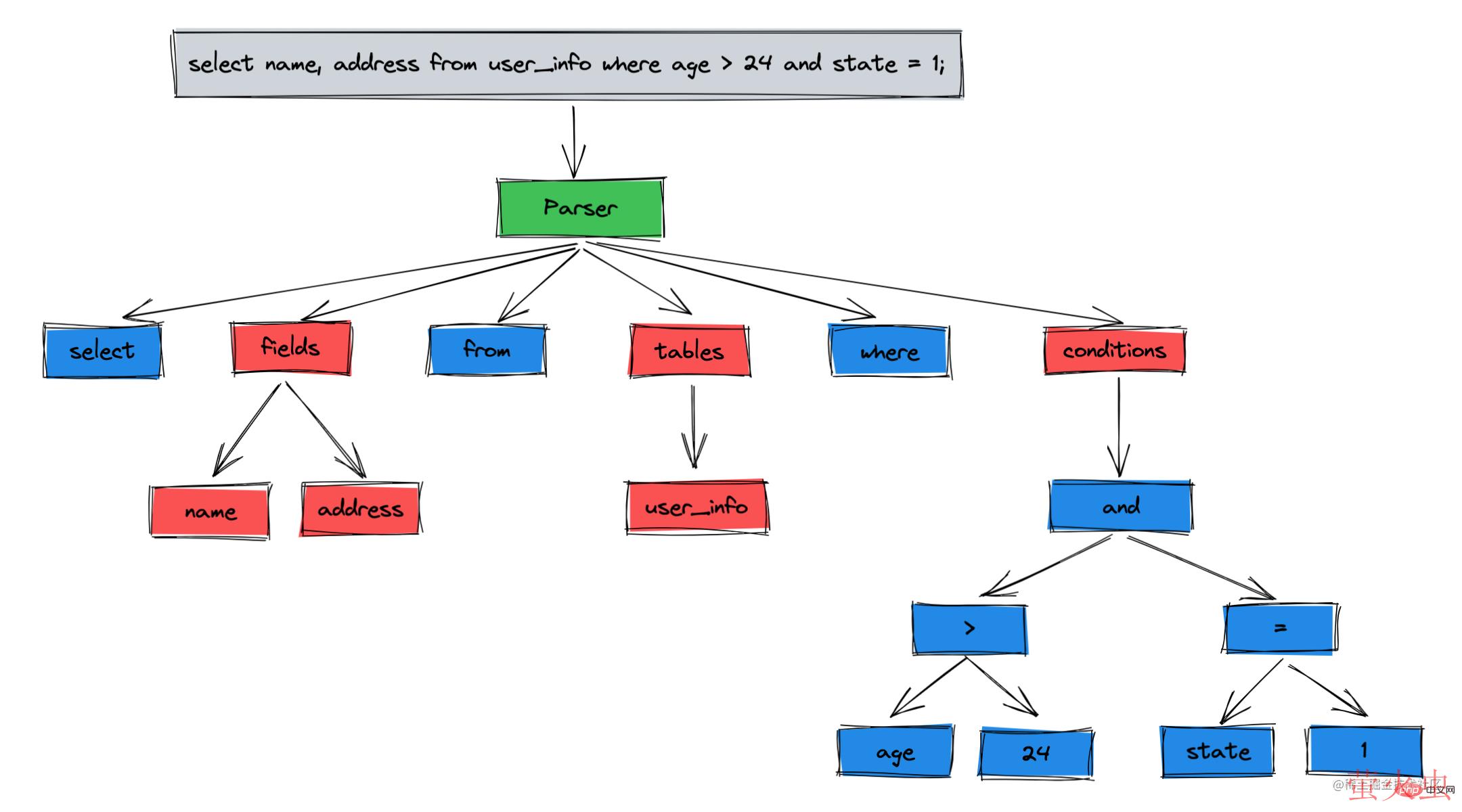 解析器根据这条 SQL 语句的语法、词法进行检查,如果没有错误的话会按关键词拆分成一个个节点,最终形成一棵解析树