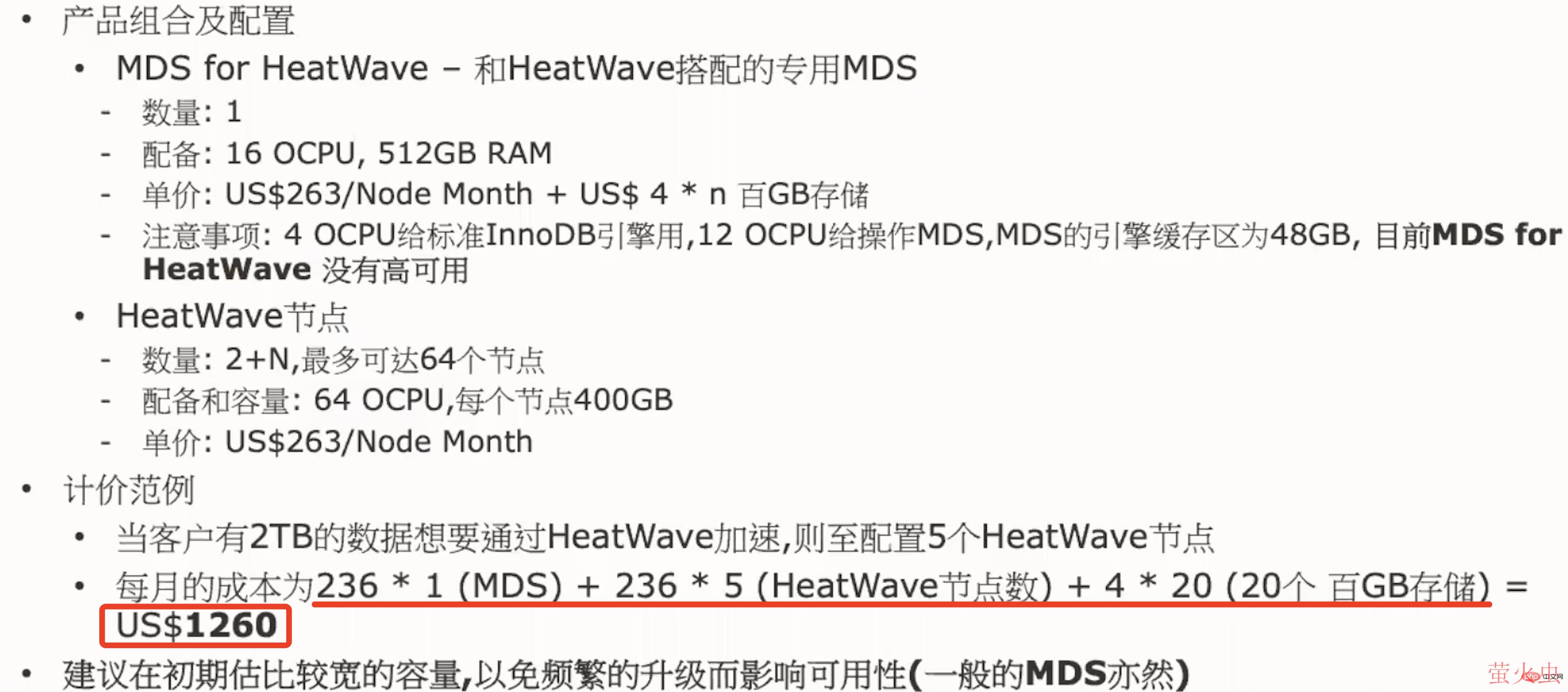 在 Oracle 公益课堂中,我们可以了解到 MySQL HeatWave 的大概使用成本,对于这张图我们只需要关注下半部分,对于 2T 数据量的环境,每月的成本约为 1260 美元。