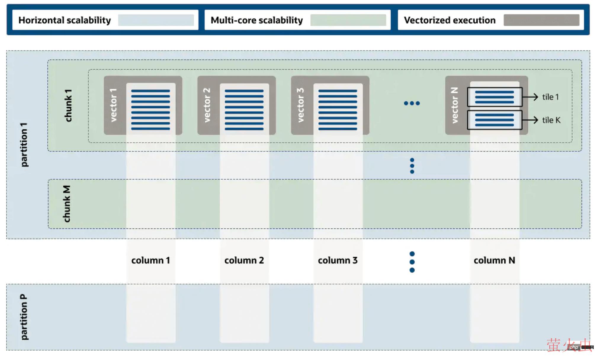 分区内部将数据按照schema定义组织成列式存储,以引入向量化执行,每个向量化计算的单位是16KiB 的 vector,各列对应行的vector组合在一起成为 chunk,每个 partition 会有多个 chunks。