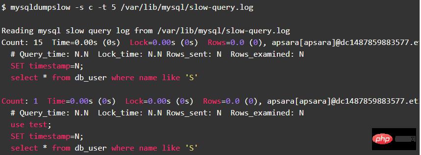 $ mysqldumpslow -s t -t 5 /var/lib/mysql/slow-query.log