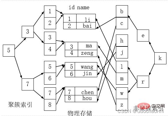 如下图,左侧的索引就是聚簇索引,因为数据行在磁盘的排列和索引排序保持一致。