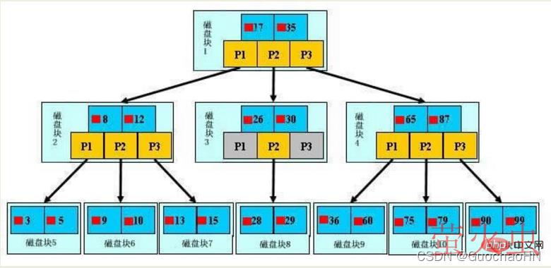 一颗b树,浅蓝色的块我们称之为一个磁盘块,可以看到每个磁盘块包含几个数据项(深蓝色所示)和指针(黄色所示),如磁盘块1包含数据项17和35,包含指针P1、P2、P3。P1表示小于17的磁盘块,P2表示在17和35之间的磁盘块,P3表示大于35的磁盘块。