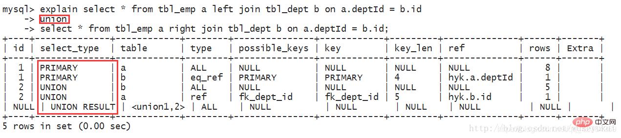 - 5、UNION:若第二个select出现在union之后,则被标记为union;若union包含在from子句的子查询中,外层select将被标记为derived