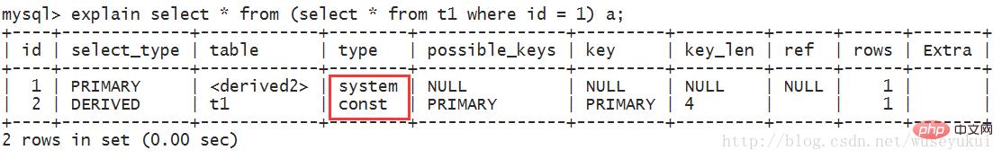 2、const:表示通过索引一次就找到了,const用于比较primary key 或者 unique索引。因为只需匹配一行数据,所有很快。如果将主键置于where列表中,mysql就能将该查询转换为一个const