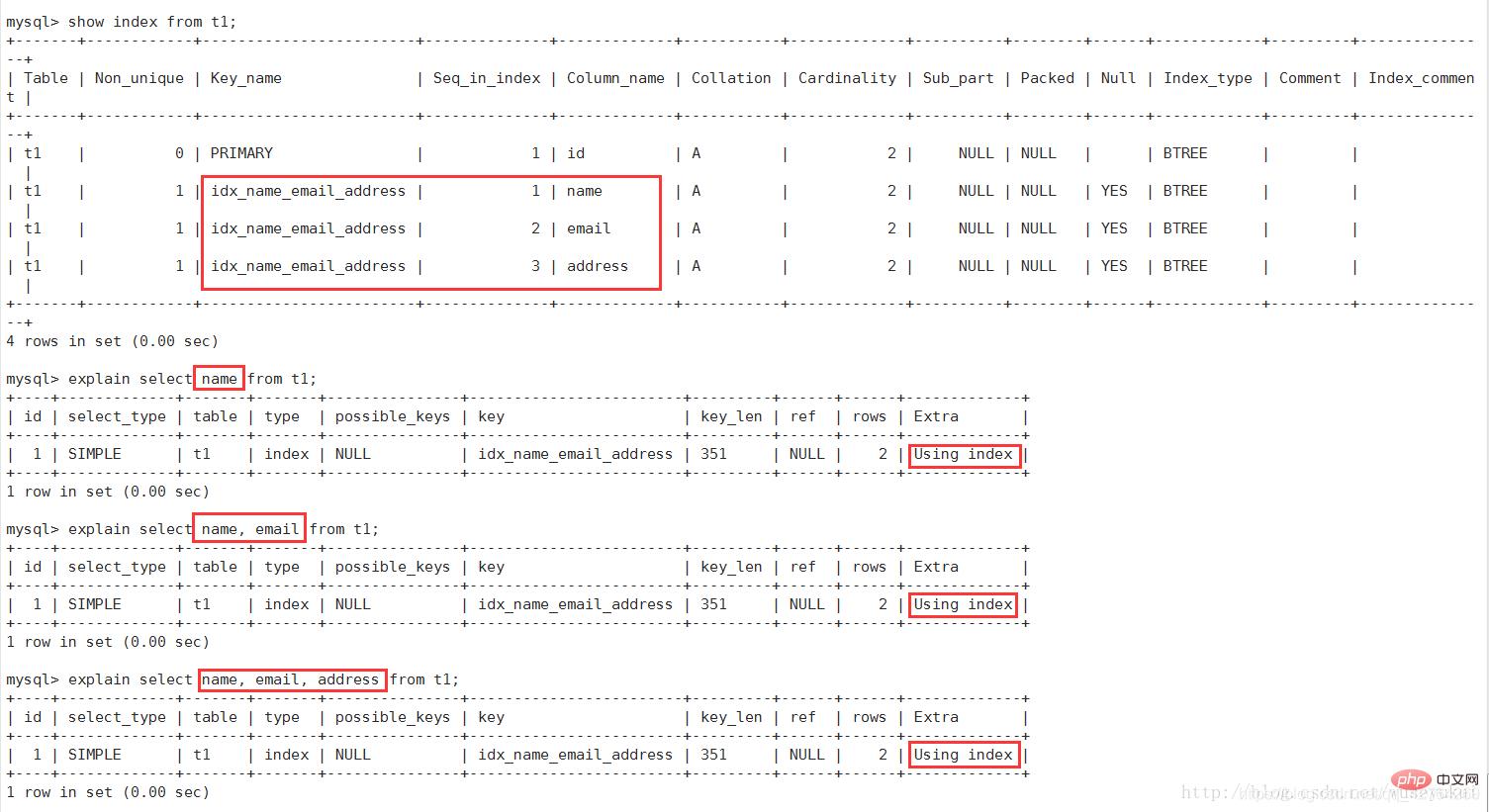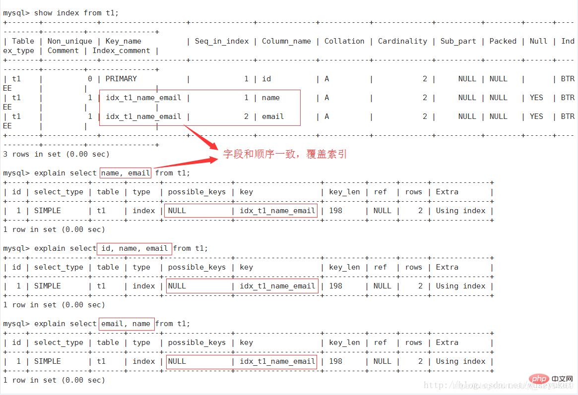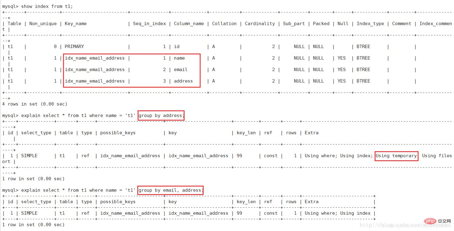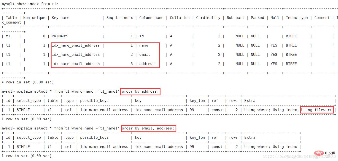 由于索引是先按email排序、再按address排序,所以查询时如果直接按address排序,索引就不能满足要求了,mysql内部必须再实现一次“文件排序”