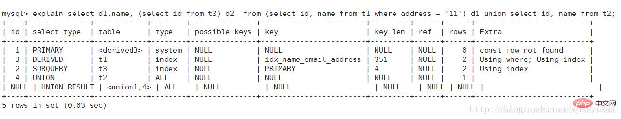 2(id = 3)、【select id, name from t1 where address = ‘11’】:因为是在from语句中包含的子查询所以被标记为DERIVED(衍生),where address = ‘11’ 通过复合索引idx_name_email_address就能检索到,所以type为index。