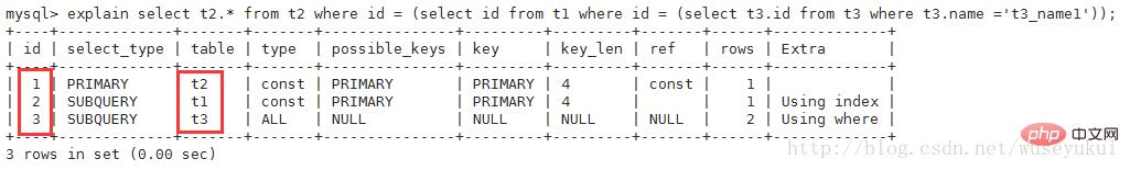 3(id = 2)、【select id from t3】:因为是在select中包含的子查询所以被标记为SUBQUERY。