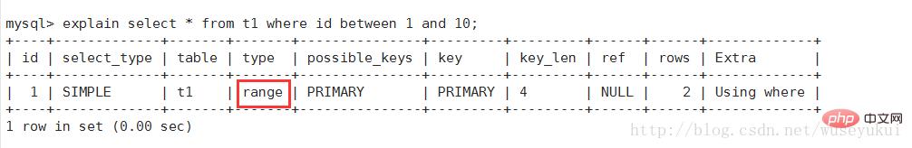 5、range:只检索给定范围的行,使用一个索引来选择行。key列显示使用了那个索引。一般就是在where语句中出现了bettween、<、>、in等的查询。这种索引列上的范围扫描比全索引扫描要好。只需要开始于某个点,结束于另一个点,不用扫描全部索引