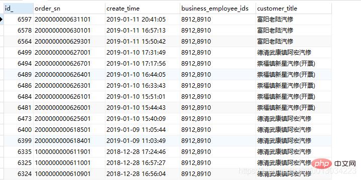SELECT t.id_,t.order_sn,t.create_time, t.business_employee_ids,cus.customer_title FROM wms_orders t LEFT JOIN wms_customer cus ON cus.id = t.buyer_id WHERE t.order_status != 100 AND t.comp_id = 8815 AND FIND_IN_SET( '8910', t.business_employee_ids ) AND t.order_status = 14 AND ( t.parent_order_sn IS NULL OR t.parent_order_sn = '' ) ORDER BY t.id_ DESC