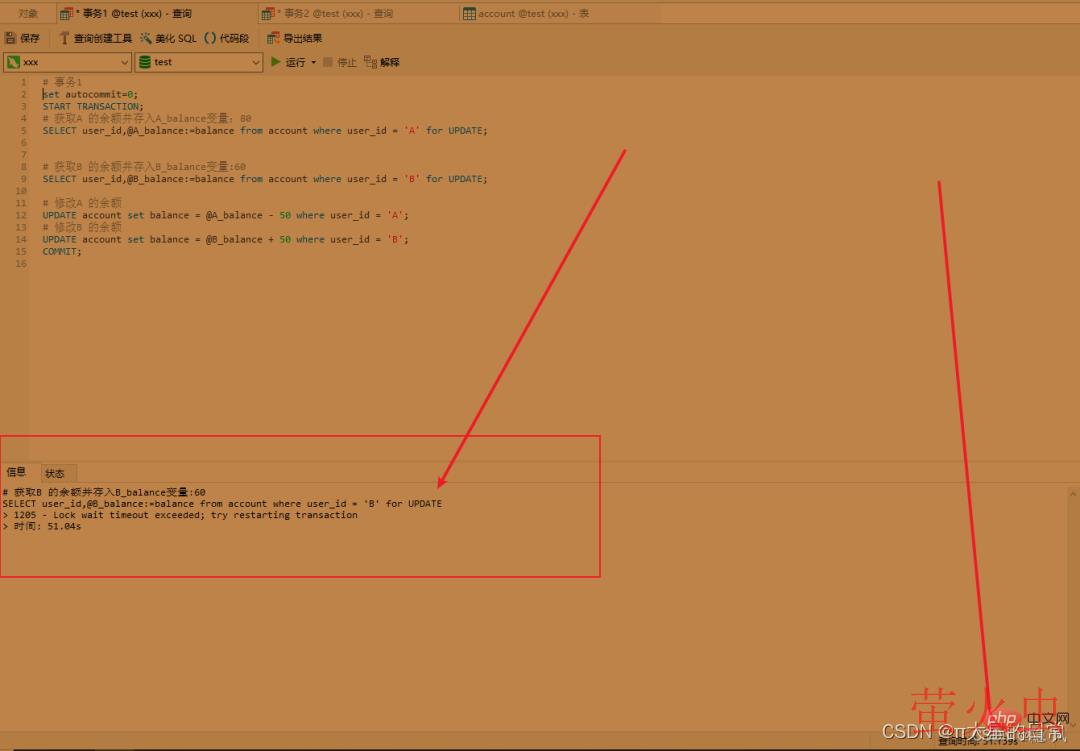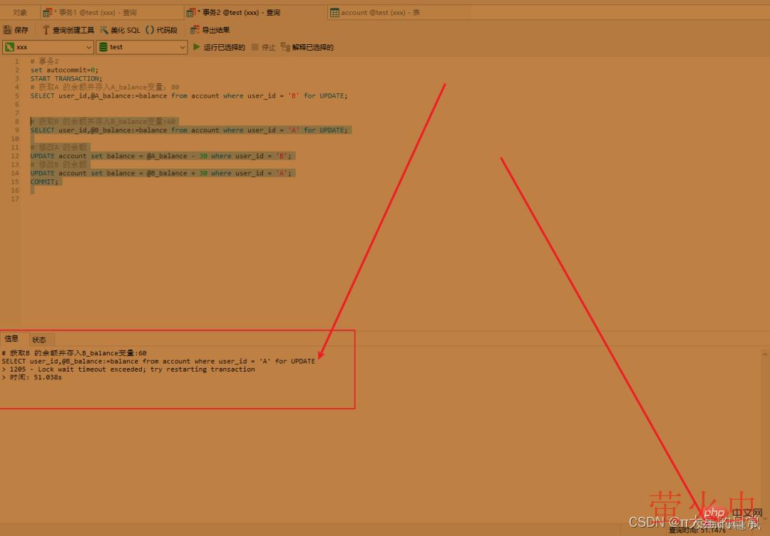 SELECT user_id,@A_balance:=balance from account where user_id = 'B' for UPDATE;3、在事务1中执行剩下的sql