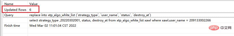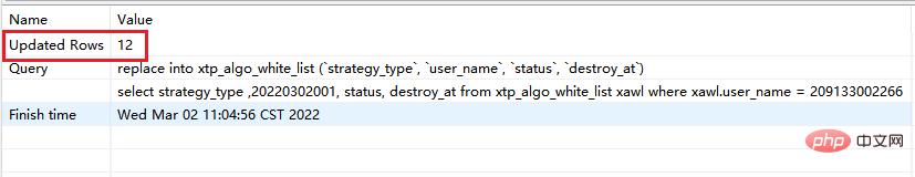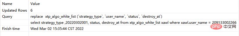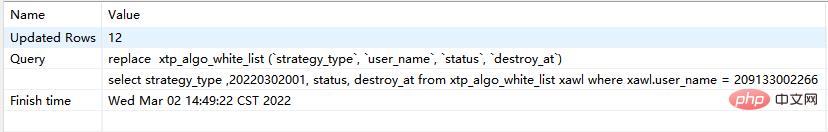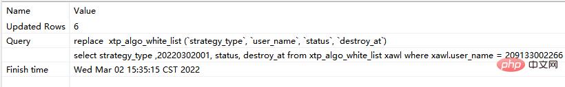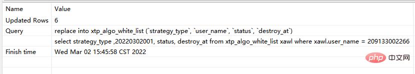 # 此时执行的是replace replace xtp_algo_white_list (`strategy_type`, `user_name`, `status`, `destroy_at`) select strategy_type ,20220302001, status, destroy_at from xtp_algo_white_list xawl where xawl.user_name = 209133002266;