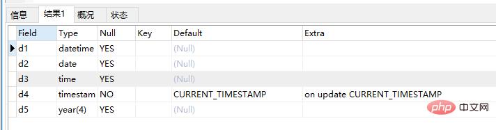 create table my_date( d1 datetime, d2 date, d3 time, d4 timestamp, d5 year )charset utf8; desc my_date