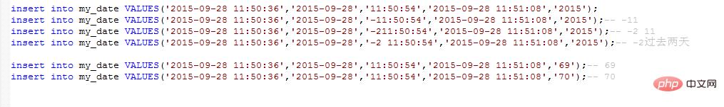 insert into my_date VALUES('2015-09-28 11:50:36','2015-09-28','-2 11:50:54','2015-09-28 11:51:08','2015');-- -2过去两天