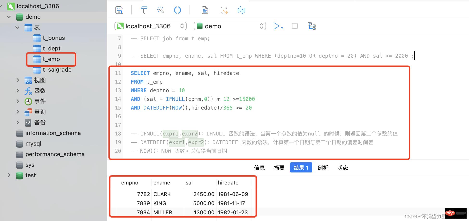 SELECT empno, ename, sal, hiredate FROM t_emp WHERE deptno = 10 AND (sal + IFNULL(comm,0)) * 12 >=15000 AND DATEDIFF(NOW(),hiredate)/365 >= 20 -- IFNULL(expr1,expr2):IFNULL 函数的语法,当第一个参数的值为null 的时候,则返回第二个参数的值 -- DATEDIFF(expr1,expr2):DATEDIFF 函数的语法,计算第一个日期与第二个日期的偏差时间差 -- NOW():NOW 函数可以获得当前日期