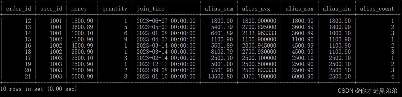 这个查询使用了 sum()、avg()、max()、min() 和 count() 函数来计算每个订单的总金额、平均金额、最大金额、最小金额和计数。这些函数后面跟着 over() 子句,用于指定计算的窗口。在这个例子中,窗口是按照 user_id 分区,按照 order_id 排序的。