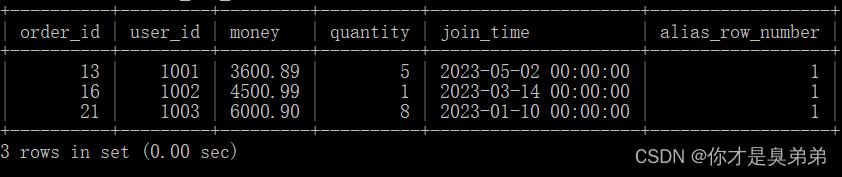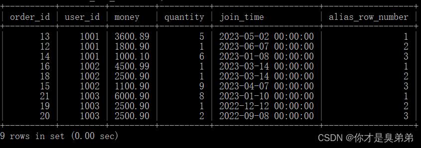 - 内部查询从 order_for_goods 表中选择了所有的列,并使用 row_number() 函数为每个分区内的行分配序号。在这个例子中,子查询将数据是按照 user_id 列进行分区 ,按照 money 列的降序排列的。