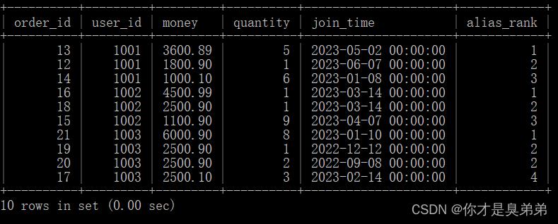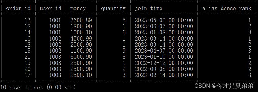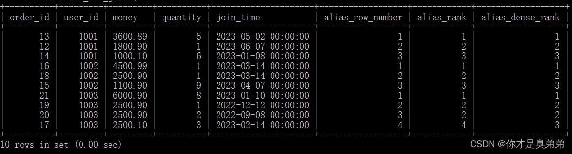 from order_for_goods;- 以上SQL语句使用了窗口函数 dense_rank() 来为每个用户计算一个别名密集排名(alias_dense_rank)。