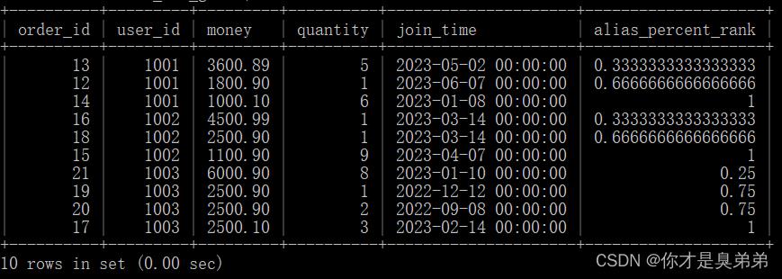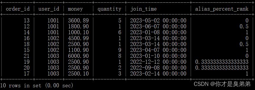 - 这个查询使用了 percent_rank() 函数来计算每个分区内的行的百分比排名。这个函数后面跟着 over() 子句,用于指定计算的窗口。在这个例子中,窗口是按照 user_id 分区,按照 money 列的降序排列的。