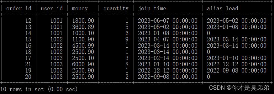- LEAD():该函数可以在结果集中的每一行之后提取数据,以便用户可以查看当前行之后的数据。