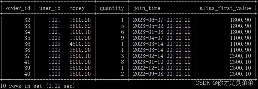 - 可以看到别名 alias_last_value3 在指定rows between unbounded preceding and unbounded following(表示从当前行开始向前和向后都没有边界地进行计算,即计算整个分区的结果。)全部统计情况下可以得到,user_id分区,join_time列排序,返回1001分区中字段money最后一笔交易金额为1800.90。