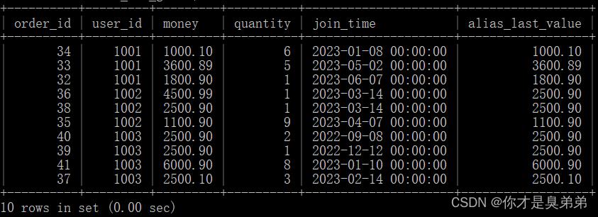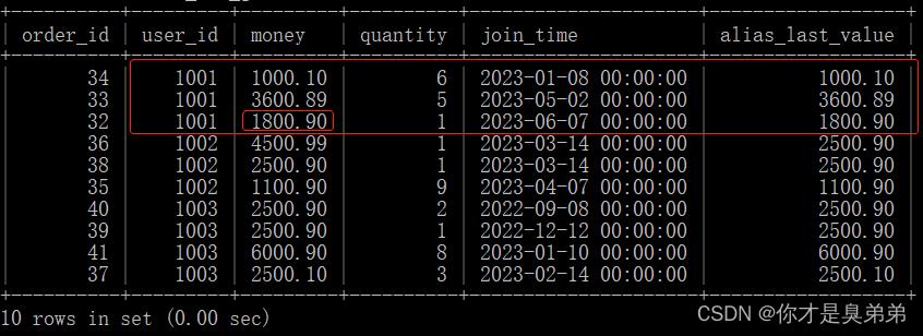 你可能会发现LAST_VALUE() 不是取窗口的最后一个值,窗口按照user_id分区,按照join_time列排序,按道理是返回1001分区中money为1800.90才对啊? 为什么? 为什么?原因是LAST_VALUE()默认统计范围是 rows between unbounded preceding and current row