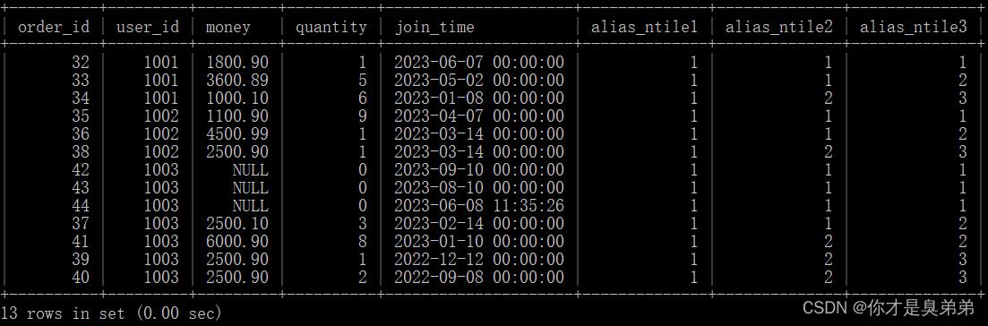 - 以别名 "alias_ntile3" 举例,该查询中ntile(3) 表示将每个用户分为三个组,partition by user_id 表示按照 user_id 分组,order by join_time desc 表示按照 join_time 降序排序。