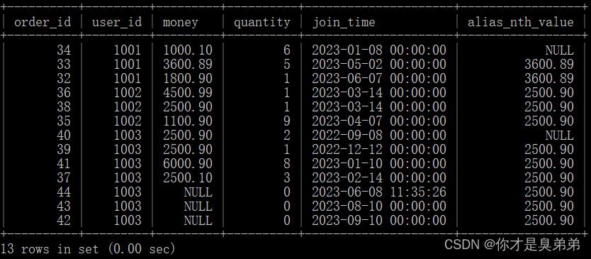 from order_for_goods;注意,如果某个用户在指定时间范围内没有数据,则NTH_VALUE()函数将返回默认值 NULL。