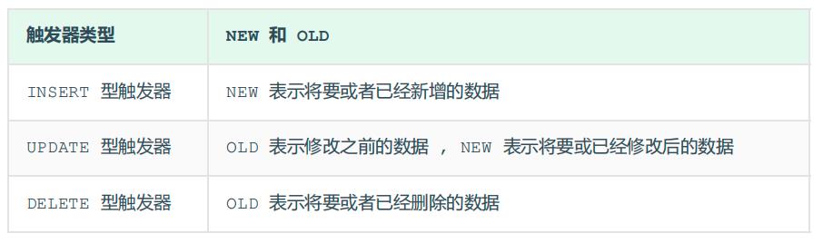 使用别名OLD和NEW来引用触发器中发生变化的记录内容,这与其他的数据库是相似的。现在触发器还只支持行级触发,不支持语句级触发。