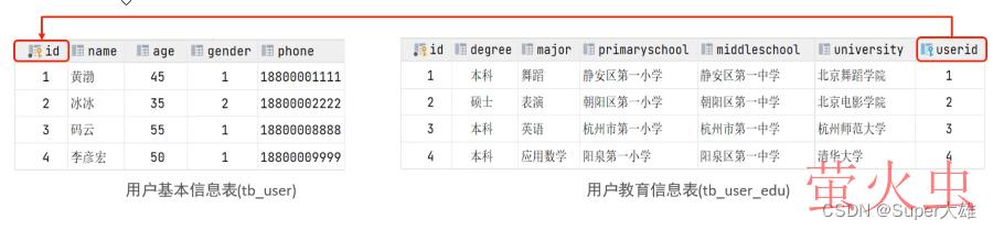 案例: 用户与 用户详情的关系关系:一对一关系,多用于单表拆分,将一张表的基础字段放在一张表中,其他详情字段放在另一张表中,以提升操作效率