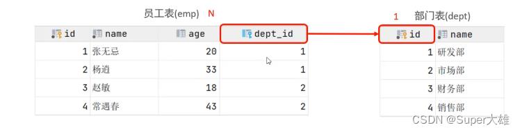 案例:部门与员工的关系关系:一个部门对应多个员工,一个员工对应一个部门实现: 在多的一方建立外键,指向一的一方的主键