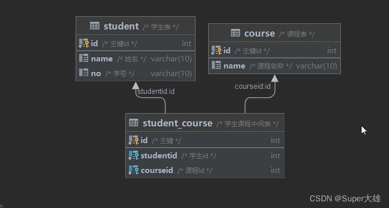 案例: 学生与 课程的关系关系:一个学生可以选修多门课程,一门课程也可以供多个学生选择实现: 建立第三张中间表,中间表至少包含两个外键,分别关联两方主键
