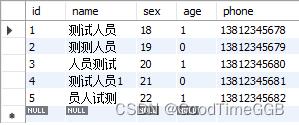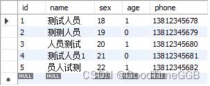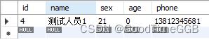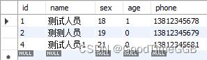 insert into people values(4,'测试人员1',21,0,'13812345681');
