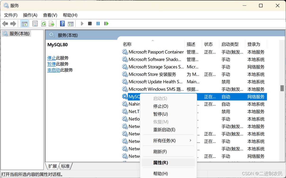 3)找到 MySQL,右键点击属性