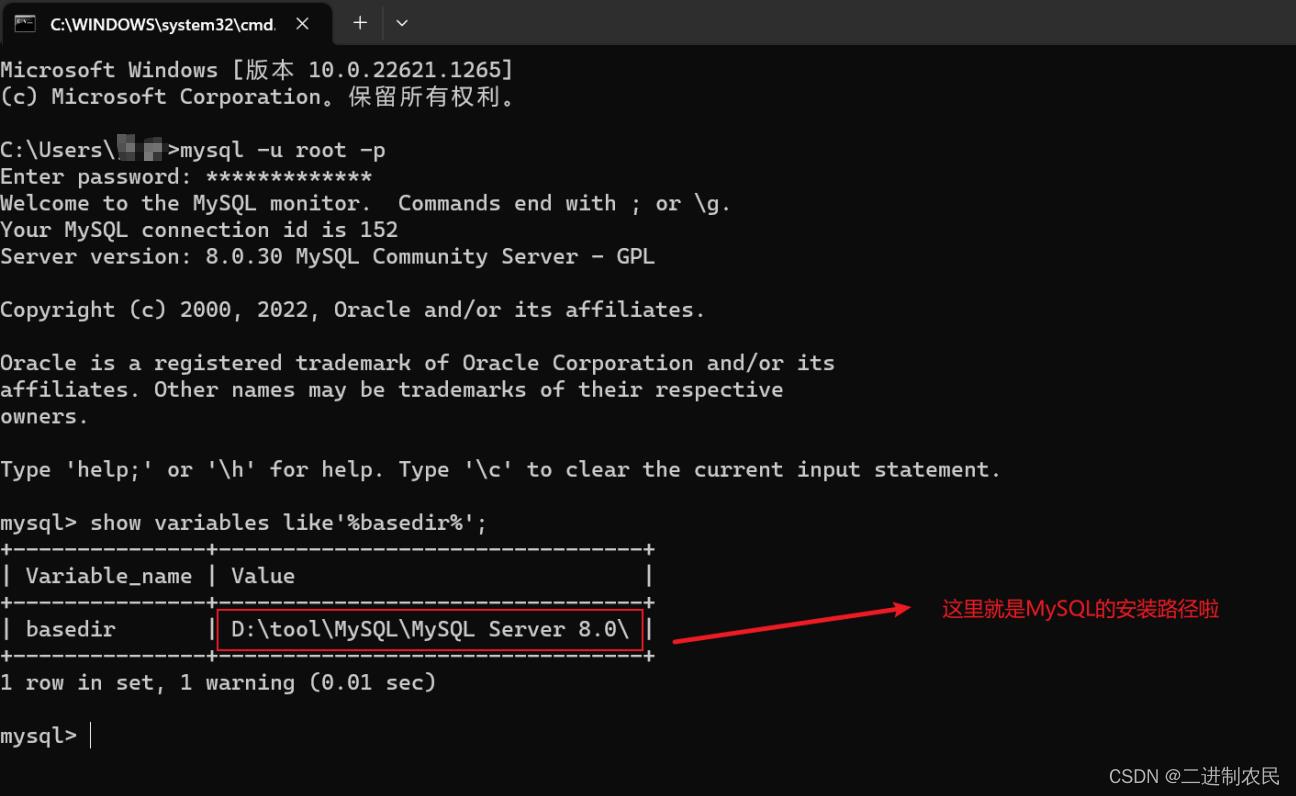 2)输入命令show variables like'%basedir%';