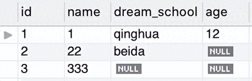第三笔记录 dream_school 列 以及 age 列是 NULL 值,用2入造来透露表现是如许的: